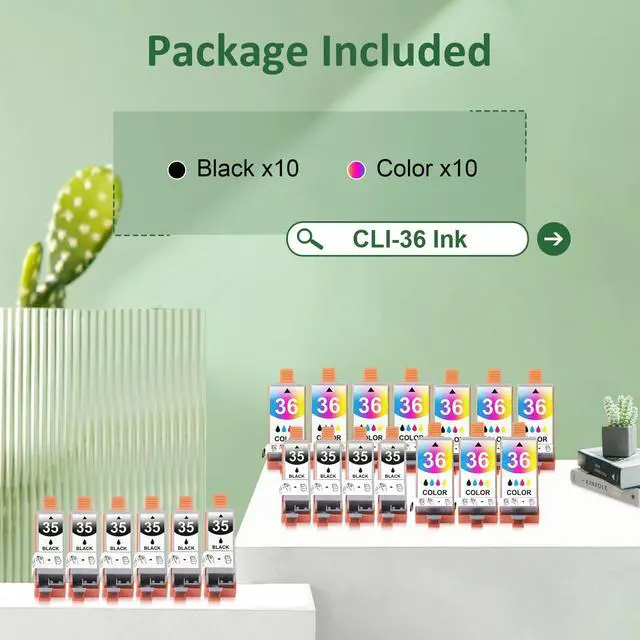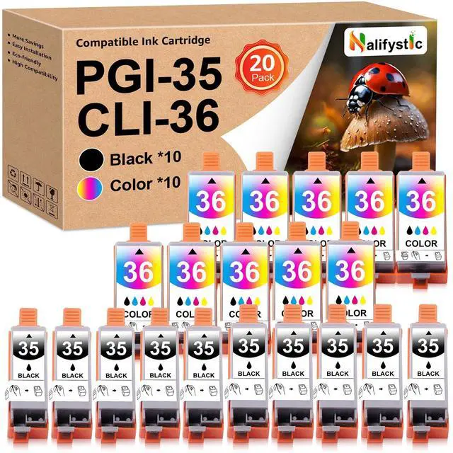 Compatible PGI35 CLI36 Ink Cartridge Includes10 x PGI-35 black Ink cartridge, 10 x CLI-36 color Ink cartridge. ^^ Compatible for Printer ModelCompatible 3536 Ink Cartridges Replacement for Canon PGI 35 CLI 36 Compatible for Canon TR160 TR150 iP110 iP100 Printers. ^^ Compatible 35 36 Approx. Page YieldThese compatible PGI-35 CLI-36 cartridge replacements for 3536 each have up to 200 pages black & up to 260 pages color and offer superior print performance and quality. ^^ Superior CompatibilityEach compatible PGI35 CLI36 ink cartridge undergoes quality and functional tests before leaving the factory, ensuring the printing quality of the ink cartridge.