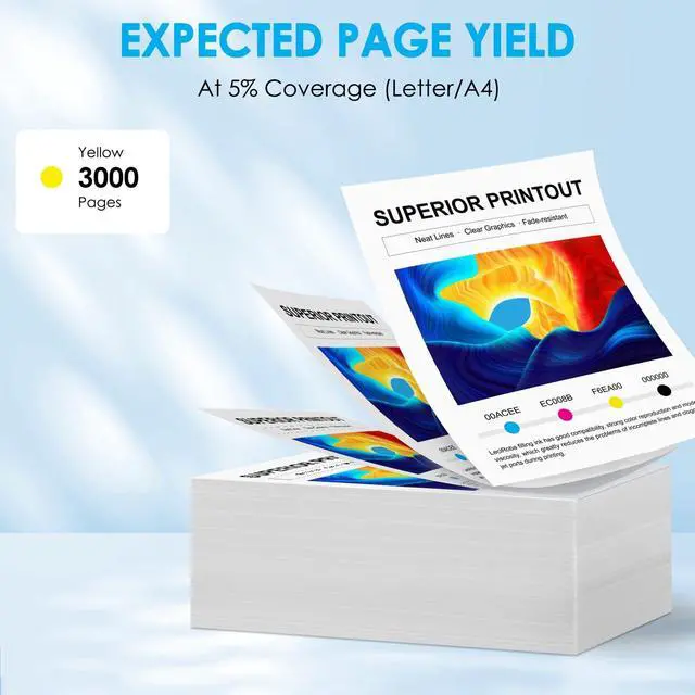 ^^ High Page Yield: 3, 000 pages per Yellow, at 5 percent Coverage of A4 letter.