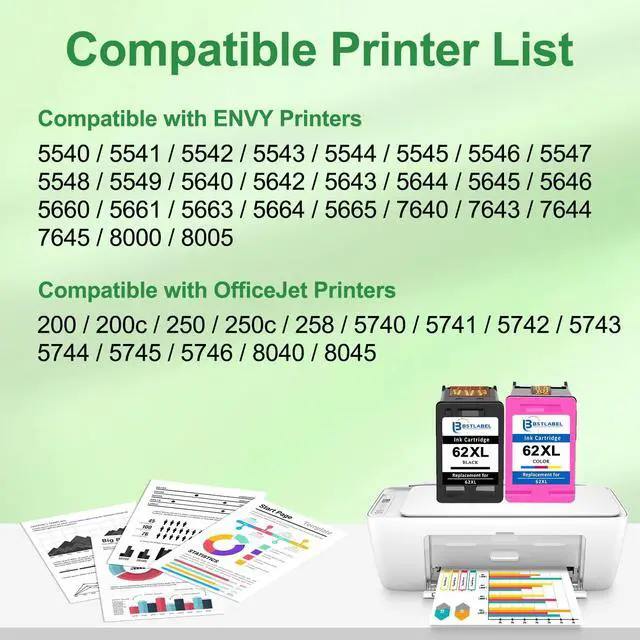 Ink Cartridge Combo Work with: ENVY 5540, 5541, 5542, 5543, 5544, 5545, 5546, 5547, 5548, 5549, 5640, 5642, 5643, 5644, 5645, 5646, 5660, 5661, 5663, 5664, 5665, 7640, 7643, 7644, 7645, 8000, 8005. ^^ BSTLABEL for HP 62XL