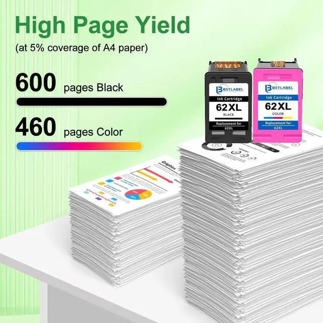 ^^ High Yield: BSTLABEL 62XL Ink Cartridge Replacement for HP 62 Ink Cartridge Combo Pack Which Page Yield Is Up to 600 pages per for hp 62 black ink cartridge, 450 pages per for hp ink 62 color at 5% coverage (A4 paper size). ^^ 62 Ink Cartridges for