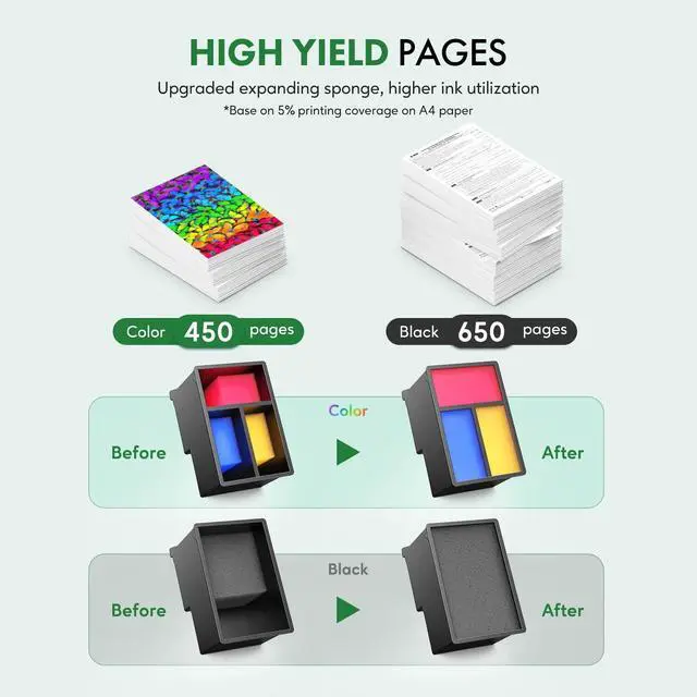 ^^ High Yield: Up to 650 pages per 62XL black cartridge, 450 pages per 62XL color cartridge.