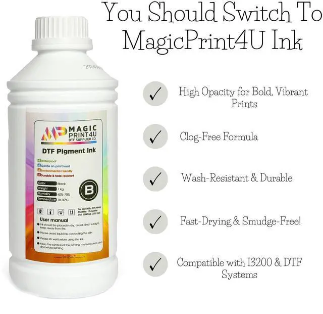 • PROFESSIONAL-GRADE PRINTING MagicPrint4U DTF Ink delivers high-volume, high-resolution prints with precision. Developed for direct-to-film workflows, each 1000mL bottle ensures uninterrupted production with rich, consistent output.