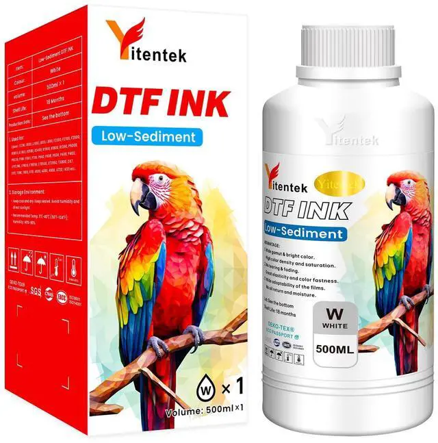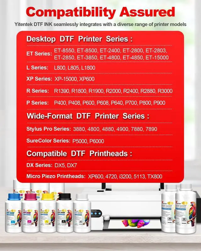 UPGRADED FORMULA Yitentek DTF ink features an exclusive patented Low-Sediment formula, combining premium German solvents, Japanese resins, and high-quality colorants. This unique formulation ensures excellent ink flow and color fastness, resulting in vibrant colors, pure whites, and soft, durable printed patterns. Our ink provides high coverage on all DTF films, featuring a wide color gamut with exceptional density and saturation that remains washable and fade-resistant. ^^ EXTENSIVE COMPATIBILITY Yitentek DTF Ink is compatible with a wide range of printers, including the L Series (L800, L805, L1800), ET Series (ET-8550, ET-8500, ET-2400, ET-2800, ET-2803, ET-2850, ET-3850, ET-4800, ET-4850, ET-15000), XP Series (XP-15000, XP600), R Series (R1390, R1800, R1900, R2000, R2400, R2880, R3000), P Series (P400, P408, P600, P608, P640, P700, P800, P900), Stylus Pro Series (3880, 4800, 4880, 4900, 7880, 7890), and SureColor Series (P5000, P6000).
