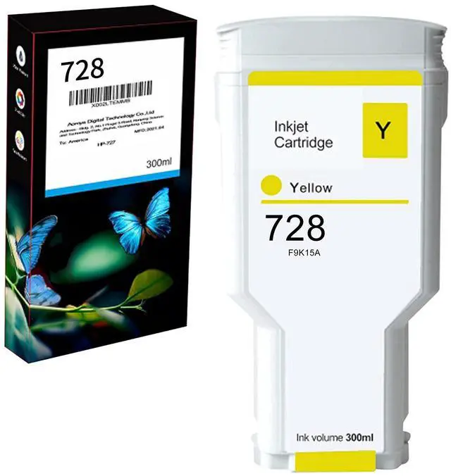 Packaging includesCompatible HP designjet 728 ink cartridges Yellow (F9K15A), 300 ml high-capacity Ink cartridge.