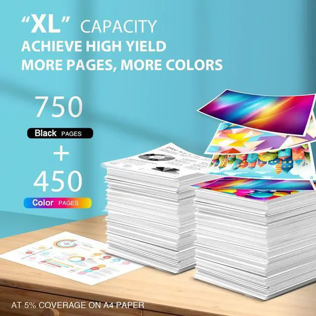 Ink Cartridges: XL capacity for hp 63 63XL Ink Cartridges has high page yield for you to print, up to750 Pages per 63XL black ink cartridge, 450 pages per 63XL color ink cartridge(at 5% coverage on A4 paper) ^^