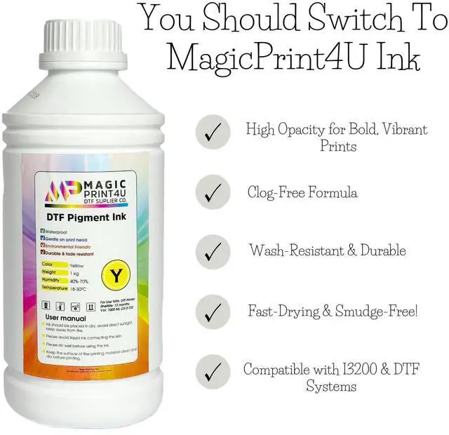 No more downtime due to clogged nozzles or inconsistent output. With a clog-resistant and fast-drying formulation, you get cleaner film transfers, sharper edges, and less maintenance. Every drop is engineered for maximum flow performance and adhesion, helping you produce professional-grade results with fewer headaches. Tested for compatibility with printers using the I3200 printhead and other DTF-capable machines, this ink supports smooth, uninterrupted workflows. Whether you're printing small runs or tackling bulk jobs, you'll get consistent quality and reliability with every print. Experience brighter whites, smoother prints, and fewer reworks all backed by MagicPrint4Us commitment to premium DTF solutions.