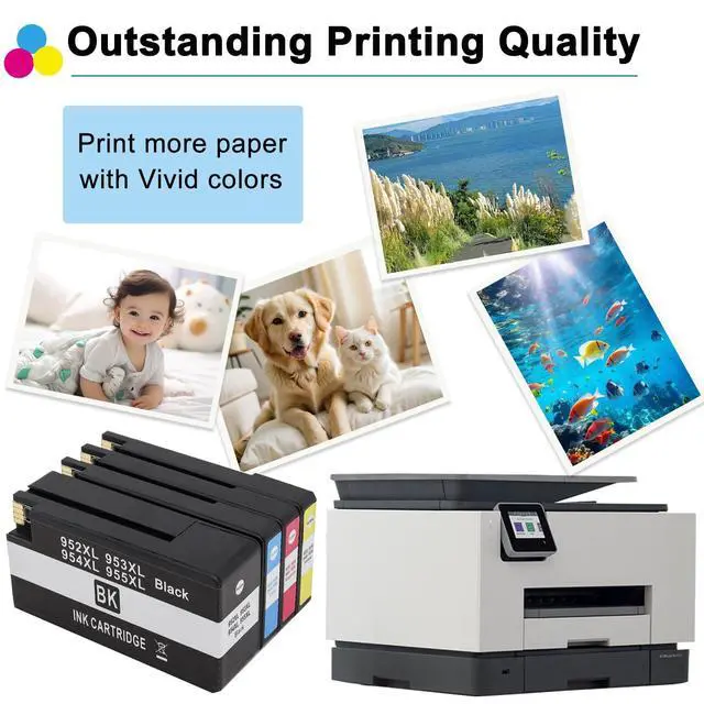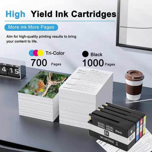High Yield & Premium Quality: 952XL black ink cartridge yields up to 1000 pages, each color 952XL ink cartridge yields up to 700 pages (based on 5% coverage). Equipped with high-quality ink that delivers vivid colors, sharp text, and fade-resistant prints, suitable for both daily documents and photo printing ^^