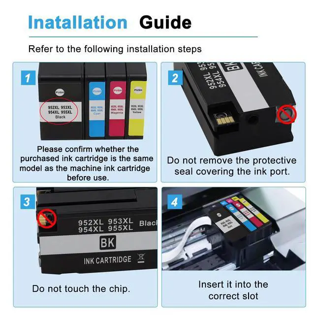 Installation Tips You May Need: [1]. Don't remove or touch 952xl ink cartridges for hp printers chip. [2]. When the printer prompts "non-original", please click "ok" or "next to continue". [3]. When the 952xl printer appears "low ink", "empty", "replace ink cartridge" and other prompts, please remove the 910 ink cartridge and reinstall it several ^^ 952XL