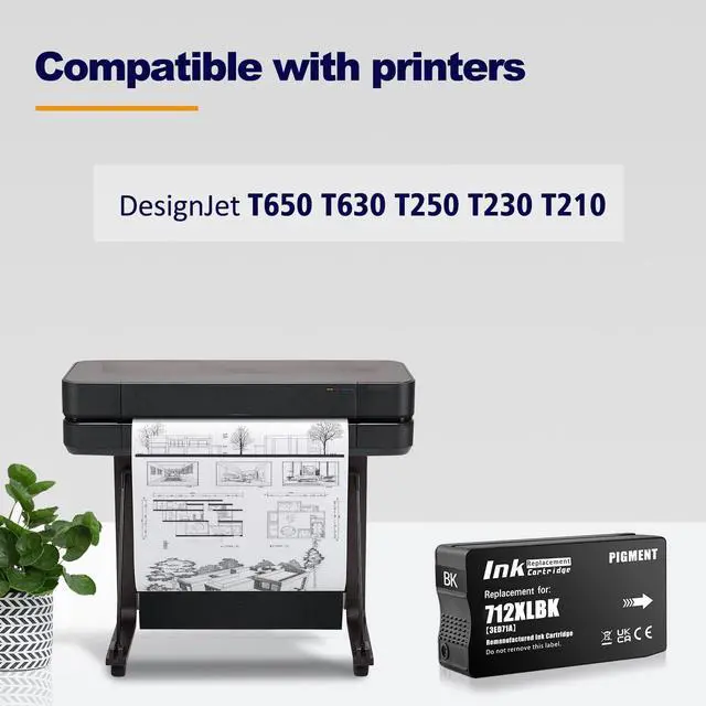 Compatible Printer - - Compatible ink Cartridge for us with HP DesignJet T650 T630 T250 T230 T210 & Studio Plotter Printers. ^^ Package Contents - - Including 1 * 712XL Black 3ED71A. ^^ Ink Capacity - - 712XL Black 80ml. ^^ High Performance - - We provide the best printing effect for users. Quality ink delivers vibrant color, clear and smooth printout for all your important photos and documents. ^^ ISO Quality Factory - - Our ink cartridges are manufactured in the factory that meets ISO 9001, ISO 14001 and RoHS standards.