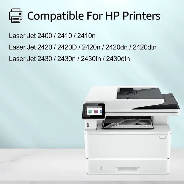 HP Printers: Laser Jet 2400 / 2410 / 2410n / 2420 / 2420D / 2420n / 2420dn / 2420dtn / 2430 / 2430n / 2430tn / 2430dtn Printer ^^ Compatible toner cartridges provide same performance and printing as genuine cartridge. Our cartridges are made of quality materials: smart chip, toner powder, smooth OPC & roller and industrial grade packaging.