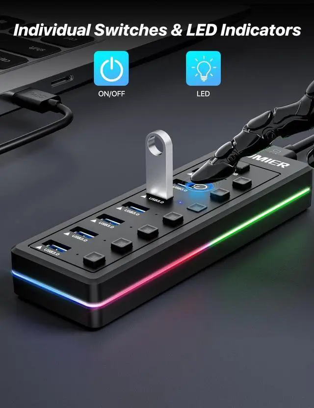 [RGB Lighting Modes] With the simple press of the RGB button, you can cycle through the Three RGB lighting modes. This USB hub transforms your desk setup, say goodbye to messes, bringing an immersive new experience to both gaming and work. ^^ [Experience 5Gbps Hyper-Speed Transmission] Unlock the full potential of our 7-port USB 3.0 hub. Effortlessly sync data and transfer massive files instantly at speeds ten times faster than USB 2.0, streamlining your workflow and eliminating waiting time. ^^ [Partition Independent Switch Control] Each USB port features its own button with an LED indicator, allowing you to easily see and manage device status.