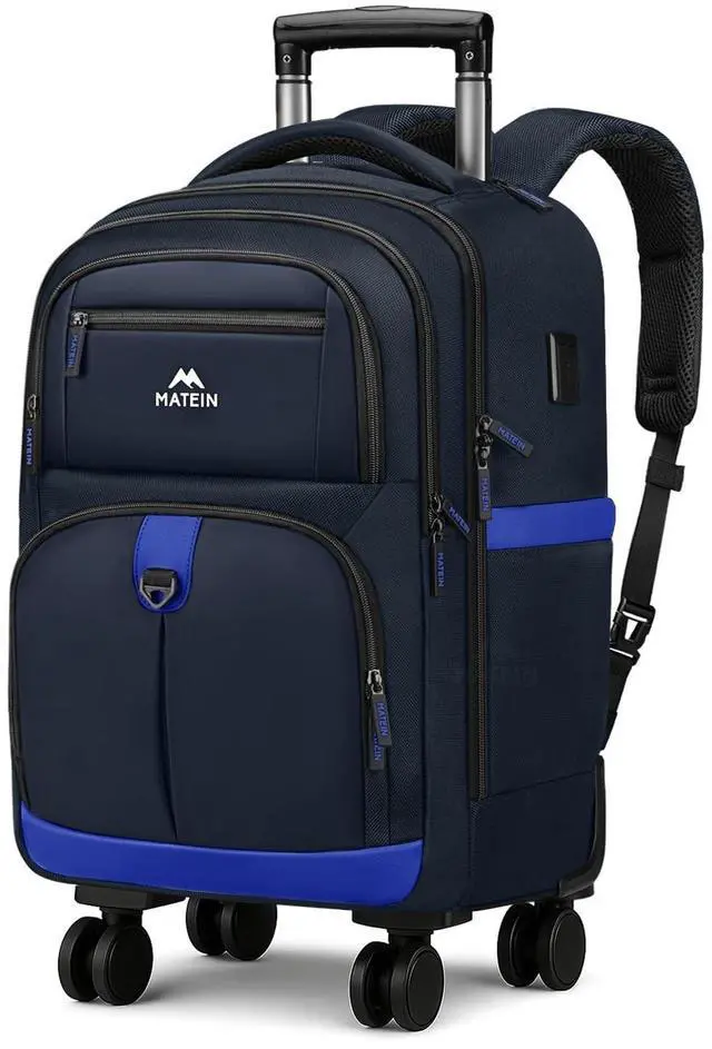 Spinner Wheels: Unlike rigid suitcases, soft-shell rolling backpack flexes to fit more while gliding smoothly on 360 spinner wheels. 4 wheels are designed to be highly flexible for smooth turning. Please note when rolling on uneven surfaces, gently press the handle downward to keep rolling bag moving straight. Aluminum telescoping handle ensures effortless maneuvering, while the reinforced waterproof bottom with corner guards and lockable zippers offers extra protection and stability ^^ USB Port &
