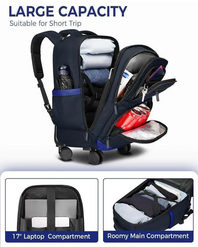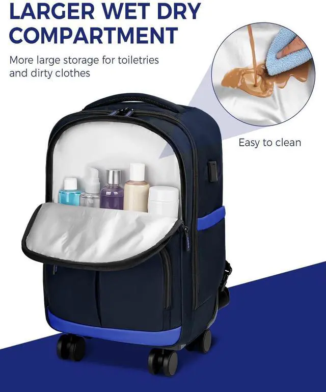 Laptop Sleeve: While hard suitcases with fixed space, soft 4 wheel backpack can expand to hold more. This rolling backpack for men has a large main compartment for clothing on short trips. Rolling travel backpack includes a padded laptop compartment fit 17 inch laptop, with 2 side slots for power bank, charger. rolling book bag with 360 rotated wheels with dimensions of 22*13*9 inches (Including Wheels Size), ideal for college/work commute/business trip ^^ Larger Wet Dry Compartment Quick Access: Roller backpack carry on luggage has a more bigger water-resistant wet-dry compartment which most rolling backpack just has a small pocket. Qucik access separated compartment is perfect for keeping damp clothes/towels away from dry items. Whether on a weekend gateway or casual, this convenient design ensures belongings stay organized and neated. Rolling backpack for adults, it helps manage essentials without worrying about mixing wet and dry items ^^ Organized Front Pocket &