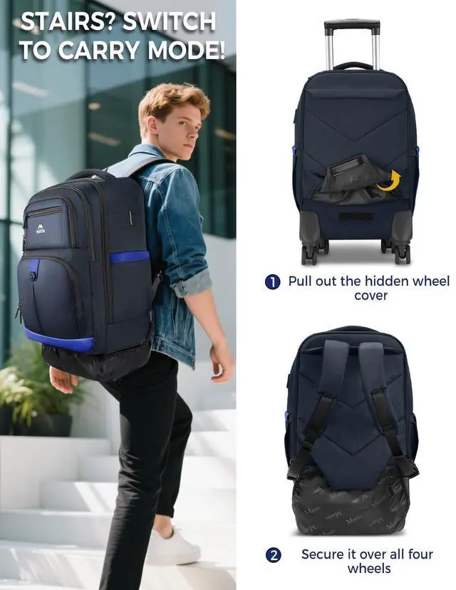 Convertible Bag: This large roller backpack has a built-in USB port (power bank not included) and converts to carry when space is tight, perfect for crowded trains or flights. The detachable shoulder straps can be folded into a hidden zipper compartment, making it switch to a spinner backpack or wheeled travel bag easily. Reinforced bottom ensures the stability of the backpack on 4 wheels, there's loop and fastener cover 4 wheels ensuring your clothes won't get dirty ^^ Spacious Main Compartment with