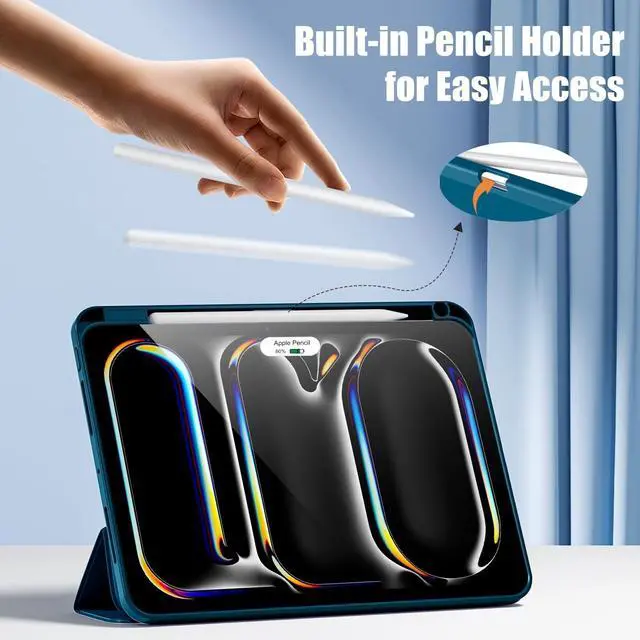 (Please note: Pencil is not included) ^^ Two Different Angles in UseThe trifold design for iPad case with pencil holder provides two convenient viewing angles for everyday use. Adjust it to 30 when typing, drawing, or chatting, and to 60 for watching videos, handling emails, or video calls. Choosing the correct angle ensures a more comfortable experience in various positions. ^^ Auto Wake & SleepThe magnetic 11 pro case supports auto wake functionality, eliminating the need to press any buttons. Its auto-sleep feature extends standby time, conserving energy and reducing the frequency of charging for iPad pro 11 inch case.