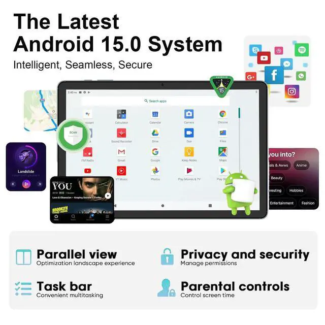 Designed for group shots and sunny-day memories, as demonstrated in vibrant outdoor photo examples. Sleek bezel-integrated front camera lens maintains a minimalist aesthetic. Reliable camera performance enhances social experiences for on-the-go memory capture. ^^ Experience the Intelligent, Seamless, Secure Android 15.0 System with Parallel View for optimized landscape use. Multitask efficiently via the Task Bar for quick app switching and improved workflow. Manage app permissions and privacy with dedicated security tools. Set screen time limits for kids using Parental Controls to promote balanced usage. Versatile multimedia support includes navigation and streaming capabilities.