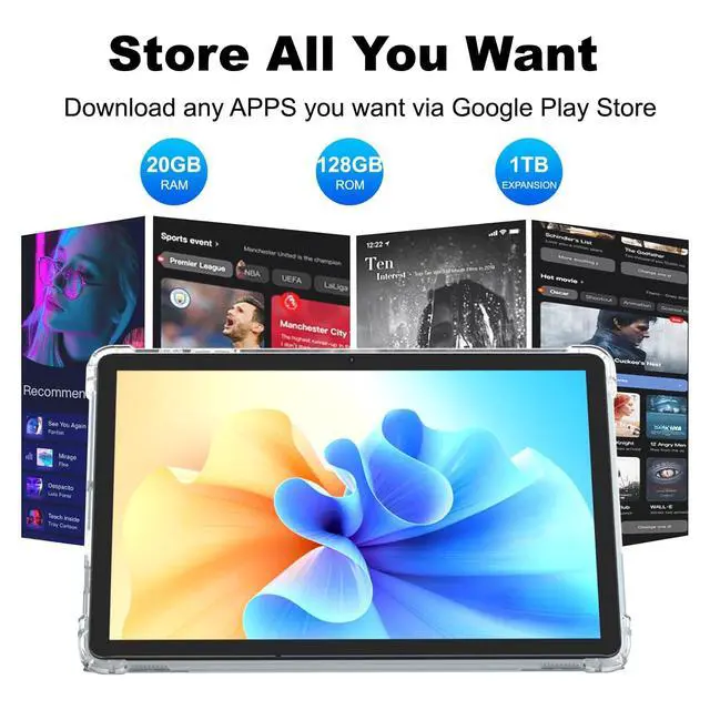 Ample storage: 20GB RAM for smooth multitasking, 128GB ROM, and support for up to 1TB expansion. Download unlimited apps via Google Play Store (sports, movies, music, productivity tools). Immersive visual display with vivid colors from abstract wallpapers, great for media/gaming. Diverse app ecosystem with icons for sports updates, recommendations, and utilities. Sleek design with a clear protective case that preserves aesthetics while safeguarding the device.