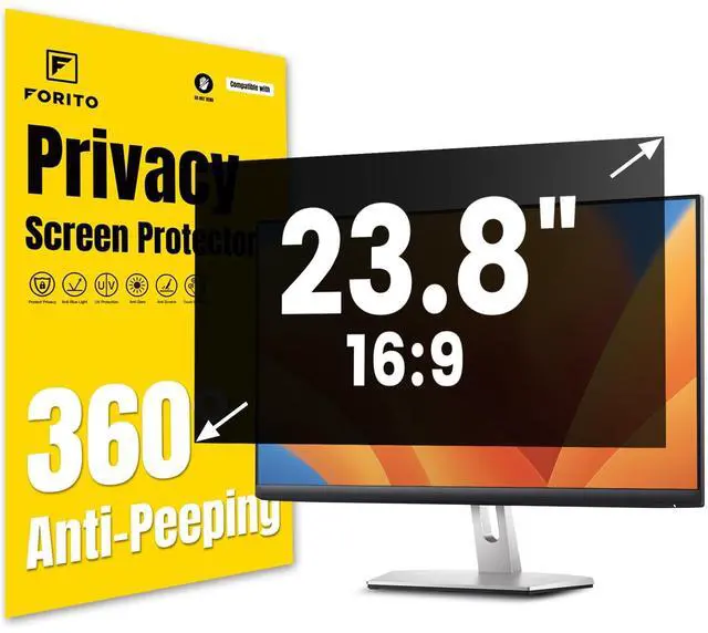 Compatible Model This 23.8 inch privacy screen for computer monitor is compatible with 23.8 inch monitor with Aspect Ratio 16:9 widescreen computers. Please verify your computer screen's length and width measurements before ordering ^^ Upgraded 360anti-peeping film With its innovative 360 privacy design, F FORITO 23.8 inch computer privacy screen offers unparalleled protection for your personal information. By effectively restricting the viewing angle to only the user in front, it prevents unauthorized individuals from seeing your display from the sides or behind ^^ Prioritize Eye Health This 23.8 inch privacy screen for monitor protects your eyes with anti-glare and anti-blue light technology.