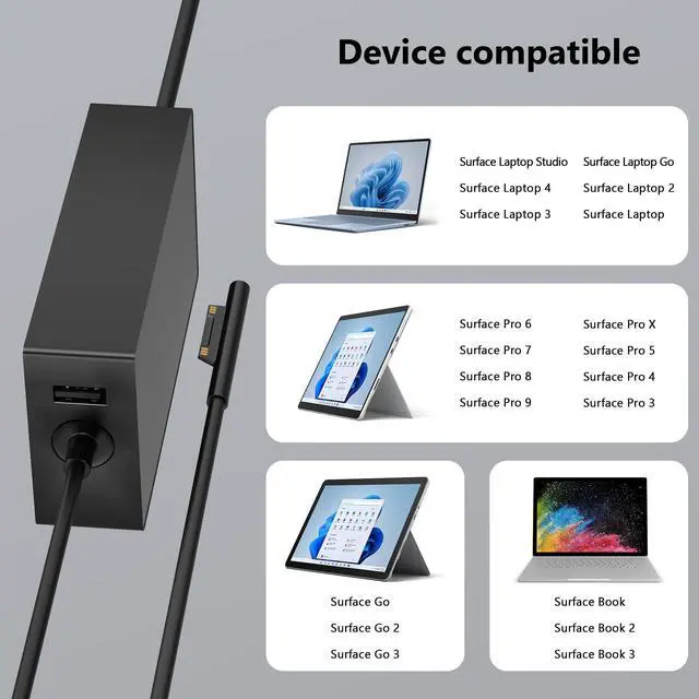 USB Port: 5V- 1.5A. (Compatible with 102W, 65W, 44W, 39W, 36W, 24W) ^^ Compatible 127W Microsoft Surface Charger Model127W Surface Book 3 charger Compatible with Surface Book 3 / Surface Book 2 / Surface Book ( 1st Gen ), Surface Laptop 3 / Surface Laptop 2 / Surface Laptop ( 1st Gen ), Surface Go 2 / Surface Go ( 1st Gen ), Surface Pro X / Surface Pro 9 / Surface Pro 8 / Surface Pro 7 / Surface Pro 6 / Surface Pro ( 5th Gen ), Surface Pro 4 / Surface Pro 3 ^^ Updated DesignCompatible with 127W Microsoft Surface Laptop Charger to quickly and easily charge your Surface Book, the charger includes an extra USB port (5V 1A) that lets you charge other devices, such as your phone, at the same time. The 10-foot power cord lets you charge and have fun anytime, anywhere, and a cool blue LED indicates charging status ^^ Comprehensive Protection 127W Surface Pro Charger with built-in safeguards can monitor temperature, voltage and other parameters in real time, protect your devices against overheating, overvoltage, Overcurrent, short-circuiting, maximumly protect your devic ^^ Package includes1 x 127W Surface Charger, 1 x 10FT Power Cord, You can buy one for your home, school, work or travel bag.