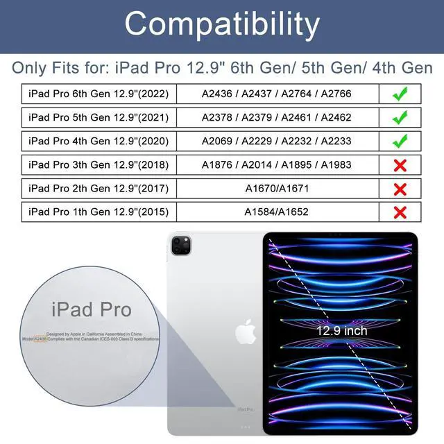 CompatibilityExclusively designed for iPad Pro 12.9 Inch 2022/2021/2020(6th/5th/4th Gen)ONLY. iPad Pro 12.9" 6th Gen 2022 (A2436 A2764 A2437 A2766), iPad Pro 12.9" 5th Gen 2021 (A2378 A2461 A2379 A2462), iPad Pro 12.9" 4th Gen 2020 (A2229 A2069 A2232 A2233). Please kindly check the model number A*** at the back of the tablet or Setting before purchase