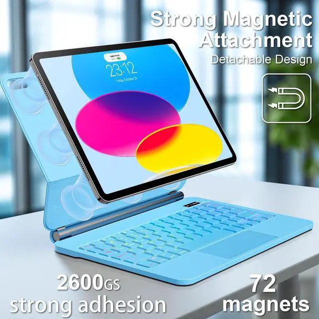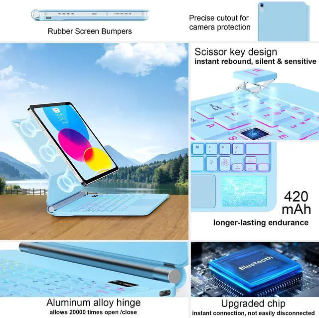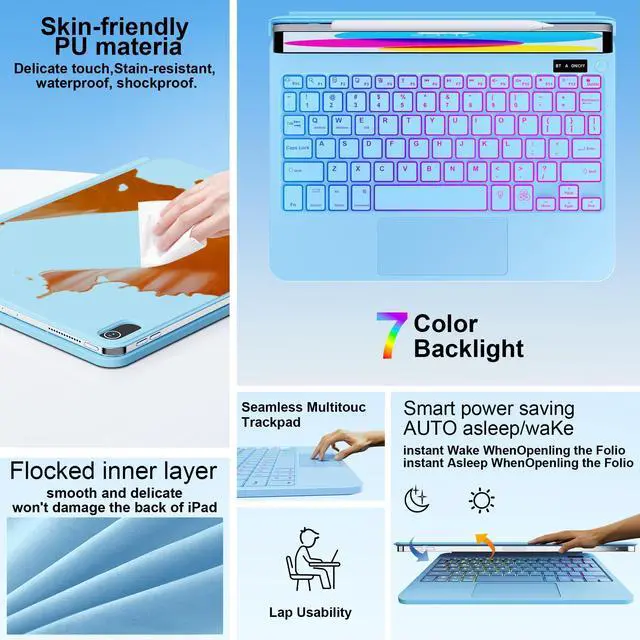 Generation: The keyboard is equipped with a 7-color backlight, adjustable to three different brightness levels. Pleas press FN + Space keys to switch 7 backlight. This feature not only adds a touch of style but also makes typing in low-light conditions more comfortable. The backlighting is engineered for optimal light diffusion, providing a pleasant typing experience whether youre working during the day or night. From dawn to dusk, adapt effortlessly! ^^ Multi-touch trackpad Keyboard for iPad 10.9 inch 10th