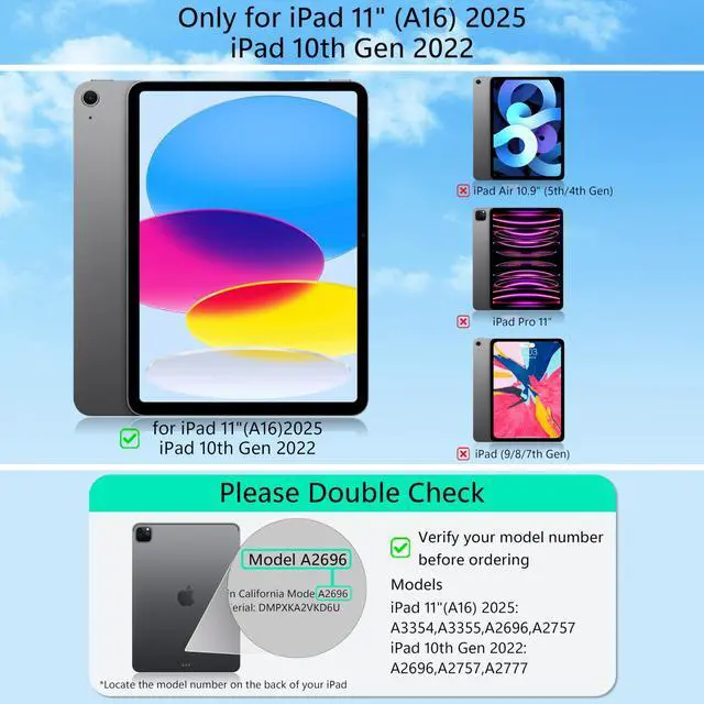 ^^ Case Compatibility: This keyboard case is only compatible with iPad 10.9 inch 10th Generation (Models A2696, A2757, A2777 ) and iPad A16 11th 2025 (Model