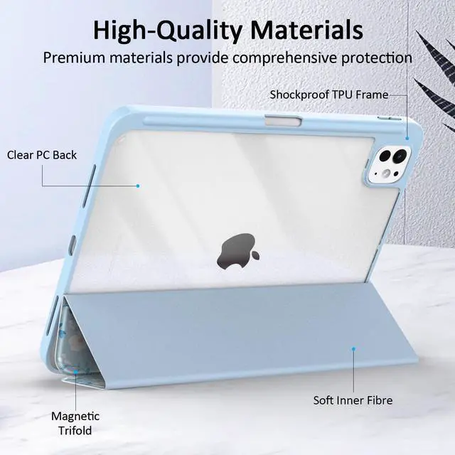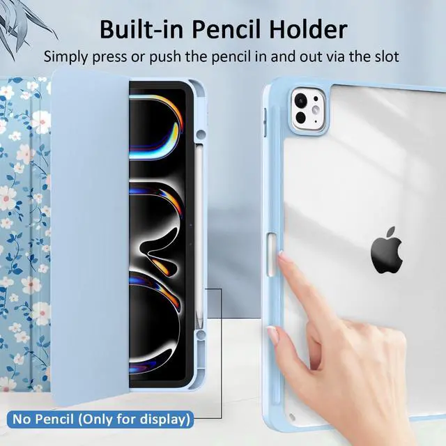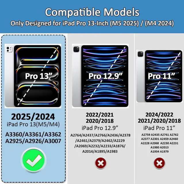 Number: A3360/A3361/A3362/A2925/A2926/A3007). Not compatible with any other devices. Please check the model number on the back of your iPad. ^^ [Full Protection] Made of durable premium PU leather and soft TPU, it can protect your iPad from drop and scratches. Hard PC transparent back cover provides strong support and show the original color of your iPad Pro 13". ^^ [Built-in Pencil Holder] The case has a built-in pencil holder, which allows you to carry and protect your pencil wherever you go. ^^ [Multiple Usage Scenarios] The tri-fold front cover of the protective case can provide two usage angles, making it easy for you to use in multiple scenarios, such as typing, video chatting, and watching movies. ^^ [Slim and Lightweight] The slim and lightweight design allows you to easily carry your iPad Pro 13-inch wherever you go.