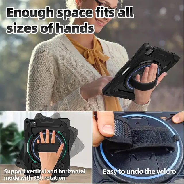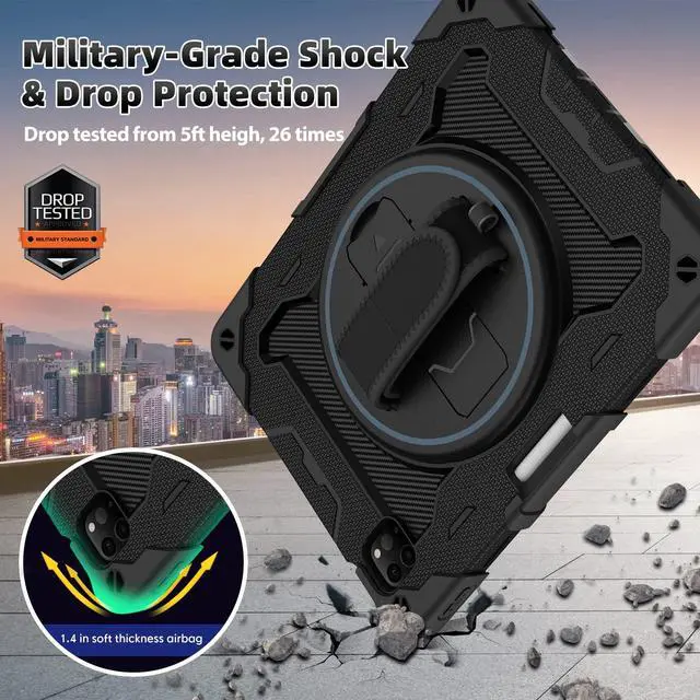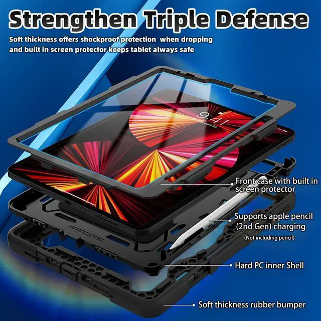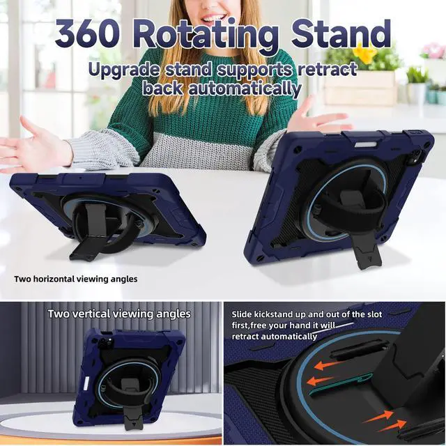 There is a Stylus Pen Holder on the back to store your pen (Pencil is NOT included) ^^ [3-layer Super Thick Full Body Strong Protection] Upgrade super thick super soft rubber + rugged PC and front screen protector frame combination. Not only increase ten times shockproof impact resistance, but also increase extra dissipate heat by upgrade built in soft endothermic sponge ^^ [360 Rotating Kickstand / Hand Strap] Multiple angles kickstand and hand strap suit for all kinds of group, such as toddler / children / kids, make money people at office/restaurant / school / warehouse / outside, students at elementary school /middle school/ high school /university, senior people at home, and another people ^^ [Built-in Screen Protector+Detachable Shoulder Strap] Raised edges on the screen protection + have built in screen protector protection, truly made work to protect screen of iPad from scratching and breaking.