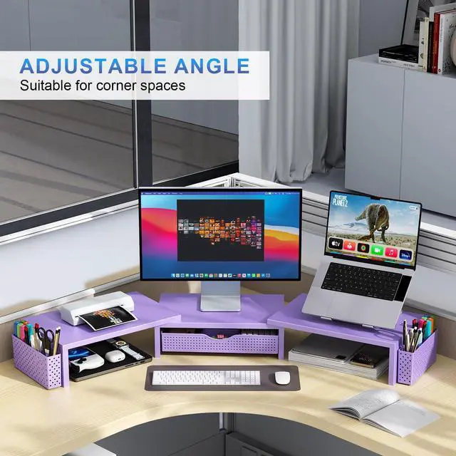 Ample Storage SpaceThe dual monitor stand features two magnetic pen holders and a drawer, allowing you to easily organize your desk accessories and office supplies, keeping your workspace clear and tidy for easier access. ^^ Work with easeThe Gianotter monitor stand for desk can adjust the monitor height to eye level, reducing neck and eye strain, improving posture, and enhancing focus and work efficiency. ^^ Maximize desktop spaceBy raising the monitor height, the space underneath the computer stand can be utilized for storing your mouse, keyboard, or other office supplies, maximizing your desktop area.