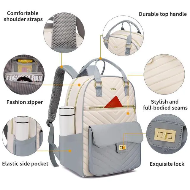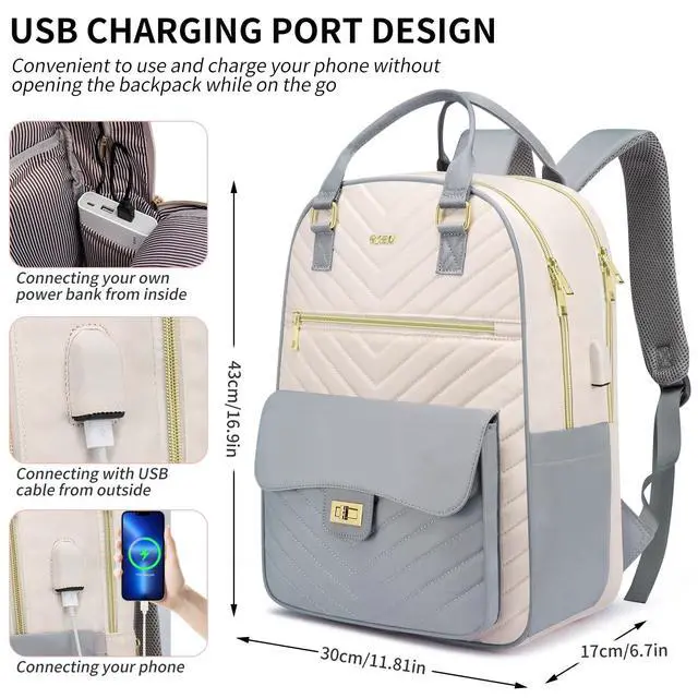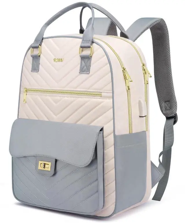 Large Capacity with Lots of PocketsTotal 20 pockets. Generous main compartments and multiple pockets to keep all of your gear secure and organized; Separate laptop compartment included 1 laptop sleeve and 1 tablet sleeve. Roomy main compartment for organizing work essential, school supplies, travel accessories. Front LOCK compartment for quick access small items ^^ Well Thoughtful DesignFashion V quilted + popular gold zipper + convenient top-handle. The heavy duty fabrics are water-repellent, dirt-resistant and easy to care for. Strong padded shoulder strap provides relief when carrying heavier loads. Side pockets for water bottle with elastics.