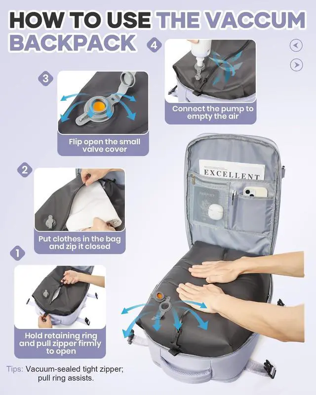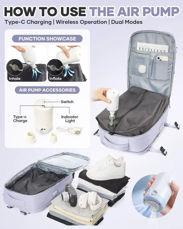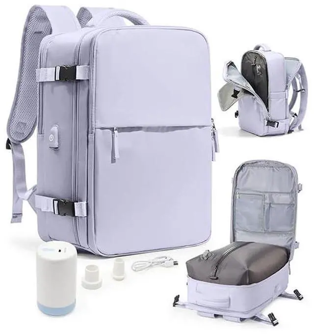 Fast Compression - FAST COMPRESSION - This backpack with AIR PUMP. compression system features bi-directional valve chambers for easy space savings. Use the included electric vacuum pump to quickly compress items (or simply press manually to release air) and also inflate items. Enjoy optimized storage space and minimize wasted luggage space. ^^ Waterproof & Durable - Featuring a water-resistant nylon exterior and a fully waterproof interior vacuum-sealed compartment, the bag keeps its contents dry even in heavy rain. Pressure-reducing shoulder straps and a breathable back pad ensure all-day comfort. ^^ USB Charging On-The-Go - USB charging port lets you power devices without opening the backpack - simply connect your power bank to the internal cable (power bank not included).