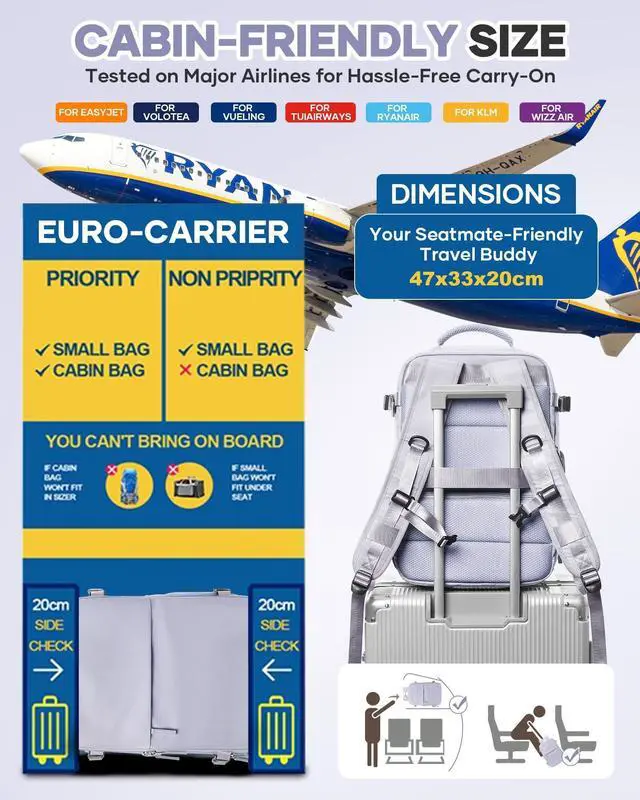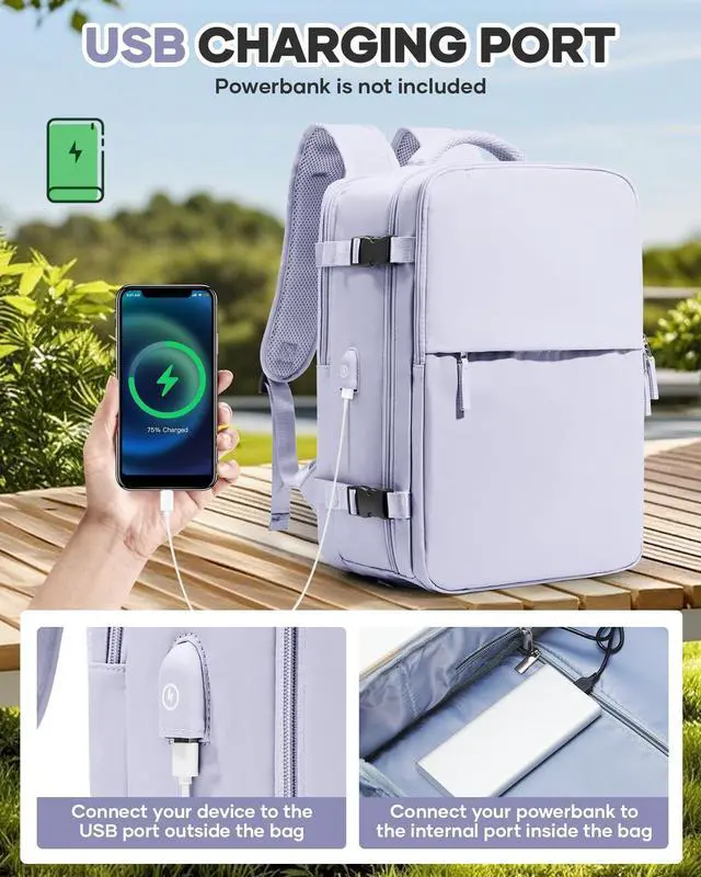 The scratch-resistant port cover maintains weather resistance while providing instant access to charge phones/tablets during travel, hiking, or daily commutes. ^^ Multi-Functional for Any Scenario - Perfect for travel, gym, or daily use! Features a main compression compartment + front accessory pocket + dedicated shoe compartment to keep clothes and essentials neatly organized. ^^ Airline Approved Backpack - Save on check-in fees by meeting major airline carry-on baggage size standards. Reduces the risk of lost luggage. The back can be snapped on to the trolley handle to create an integrated mobility solution, allowing you to travel through airports with ease.
