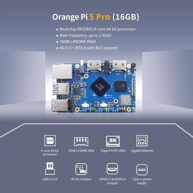 , with an M. 2 M-key slot that supports the installation of NVMe SSD or SATA SSD. ^^ Wide Range of Application Scenarios - Orange Pi 5 Pro is compact, measuring only 89mmX56mmX 1.6 mm, and powerful enough to be widely used in tablets, edge computing, artificial intelligence, cloud computing, AR/VR, intelligent security, smart home and other fields, covering AIoT various industries. ^^ Orange Pi Single Board Computers can builed a computer, a wireless server, Games, music and sounds, HD video, a speaker, Android, Scratch.