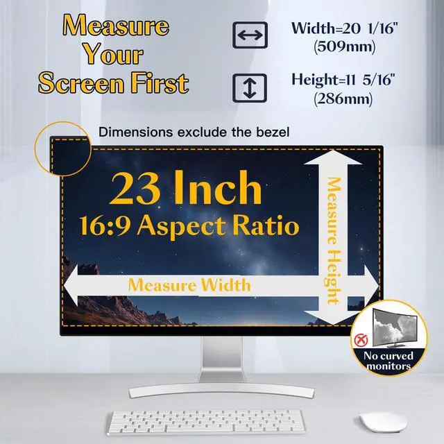 Only fit for 23 inch 16:9 MonitorsJEEETINTX 23 inch Privacy Screen Filter for computer monitor is suitable for frameless/thin/narrow bezel monitors with size of 23 inch