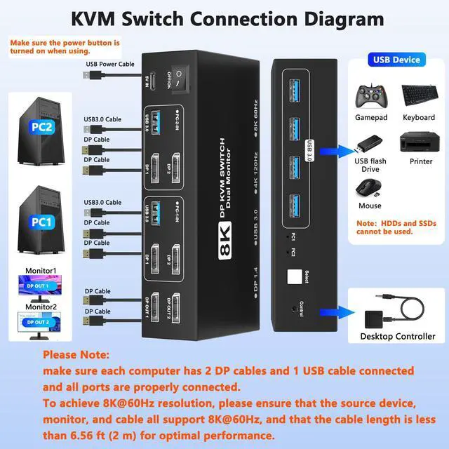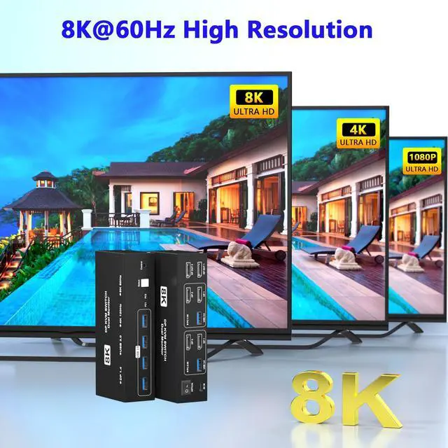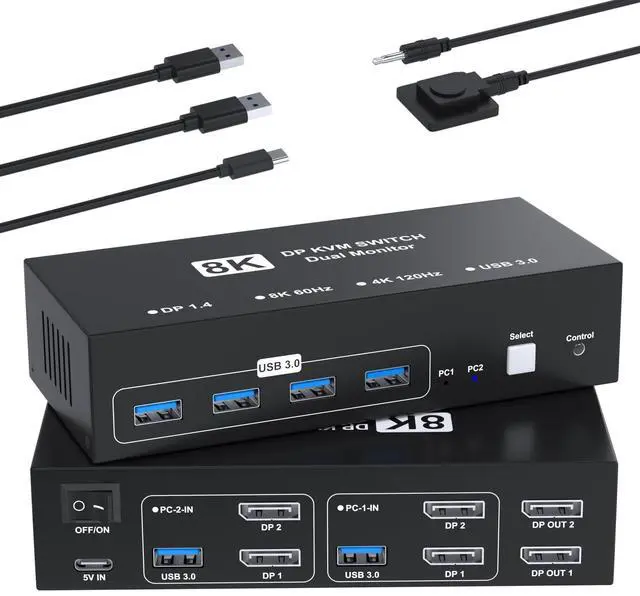 Displayport KVM Switch 2 Monitor 2 ComputersThe KVM switch display port allows two computers with displayport to share two displayport monitors and 4 USB devices. Its compatible with laptops and desktop computers, you can easily switch between them with the press of a button. LED lights clearly show which computer is active. Important NotesThis switch does not support HDMI ports. Each PC needs to be connected with 2*DP cable + 1*USB cable to get dual screen display properly. Docking station and additional adapter cables are not supported. ^^ Ultra HD 8K@60Hz Dual monitor KVM switches displayport supports up to 8K@60Hz and 4K@120Hz visual experience and is backward compatible with 2K@144Hz, 1080P, etc.
