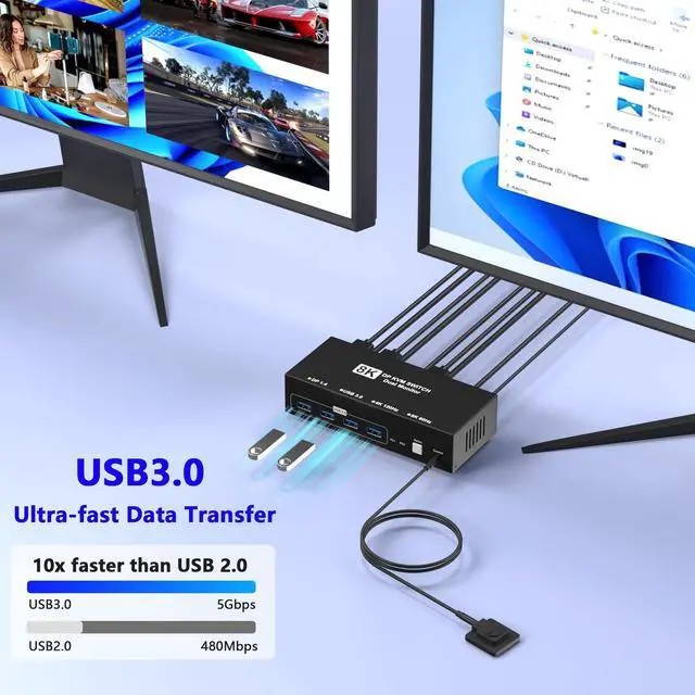 (Note: To achieve the highest resolution, you must ensure that both the source and the monitor, as well as the DP cable support 8K@60Hz) ^^ 4 High-Speed USB 3.0 PortsIn addition to being compatible with two computers and two monitors, this KVM switch also has four USB 3.0 ports. All four ports can be used simultaneously, offering a fast data transfer rate of up to 5Gbps. Easily connect peripherals like keyboards, mouse, printers, scanners, mobile hard drives, USB drives, and other USB devices while ensuring efficient performance. ^^ Two Ways of SwitchingThis monitor switch for 2 computers features a physical button on the main unit, allowing you to easily toggle between two connected PCs with a simple press. In addition to the built-in button on the switch, this KVM switches two computers one monitor switch comes with a desktop controller, allowing you to quickly and conveniently switch between two computers without needing to reach for the main unit.