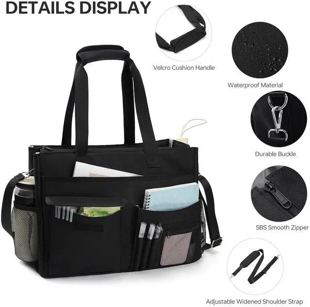 PREMIUM MATERIAL: The teacher tote bag is made of polyester with encrypted stitch, which is water-resistant and scratch-resistant. The bottom provides protection and supports weight. Smooth zipper & magic paste pocket make this tote bag using freely ^^