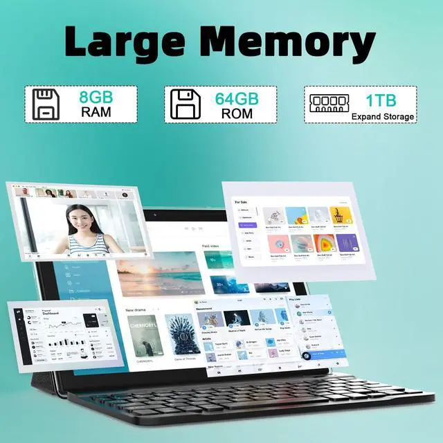 Great 2 in 1 tabletThis YQSAVIOR Tablet comes with bluetooth keyboard, wireless mouse and foldable protective case. it can flexibly turn tablet into a laptop mode or computer mode. you can switch them as needed. It will be convenient device for working, learning efficiently and quickly handle daily tasks. ^^ 8GB+64GB+1TB Expand TabletsThis Tablet features 2+6GB of RAM and 64GB ROM of storage, Support most 1TB Expand by micro sd card. You can storage more apps, Musics, Videos, Movies and pictures on your tablet. In addition, tablet adopt lastest android system, passed the GMS certification.