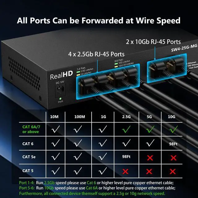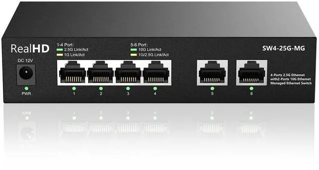 10G/ 2.5G Super-FastThis 10 gigabit switch features 2 x 10G RJ45 ports and 4 x 2.5G Base-T port, providing higher-speed connectivity for your devices and allowing you to easily upgrade your network to support the latest 2.5G ethernet standard.
