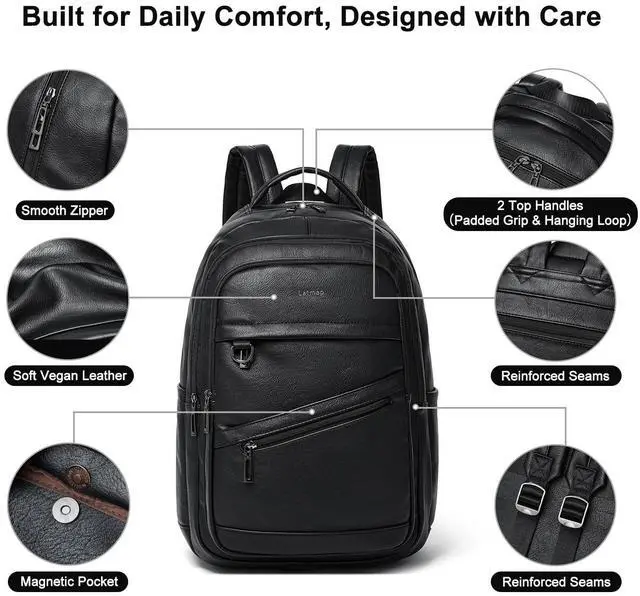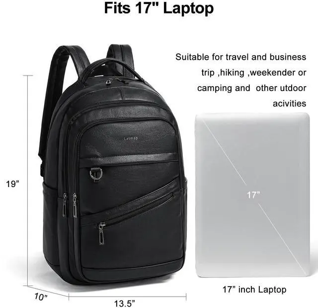 Organized Storage: Measuring 13.5" x 10" x 19", this travel backpack for women offers a roomy 43L capacity with 12 functional compartmentsincluding a padded laptop sleeve and side bottle pockets. Whether youre heading to class or packing for a short trip, its the ideal college bookbag or daypack to keep everything organized. ^^ Soft Vegan Leather with