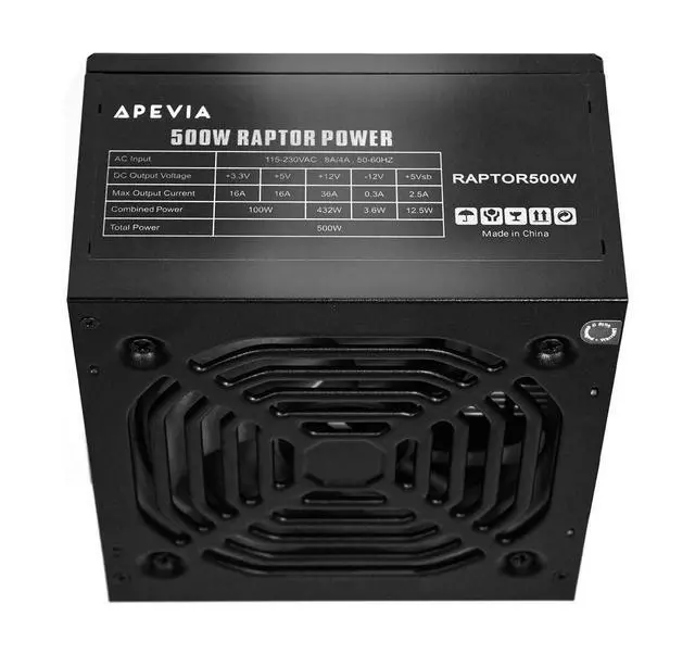 Apevia RAPTOR500W Raptor Series 500W ATX Power Supply with 1 x 120mm Auto-Thermally Controlled Black Case Fan (No LED Lights). 1 x 20/24pin Main Power /1 x 8pin CPU connector (P4+4) 12V / 3 x SATA/ 3 x Molex/ 1 x 6+2-pin PCI-express/ 1 x Floppy Connectors. 115/230V Switch, 5% Tolerance of 5V, 3.3V & 12V Output. Max. Output Current + 3.3V (16A), +5V (16A), +12V (36A), -12V( 0.3A ), +5Vsb( 2.5A ), Circuit/Over-Current/Over-Voltage/Over-Power/Under-Voltage/Over-Temperature Protections. For safety, do not overload, abuse or modify the power supply unit.