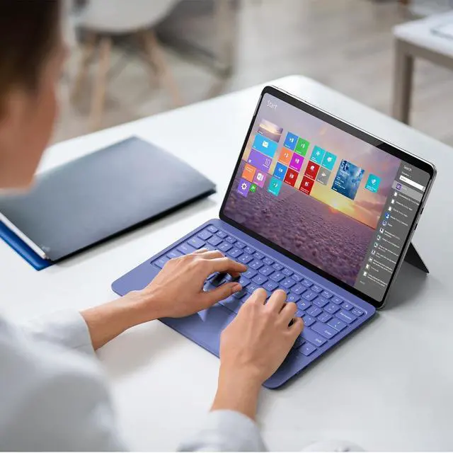 A bluetooth keyboard cover design for Surface Pro 12 " 1st 12 inches laptop released in 2025, with skin-like panel and 7 colors of background lights. Magnetic docking with tablet. the back side made of comfortable and durable microfiber.