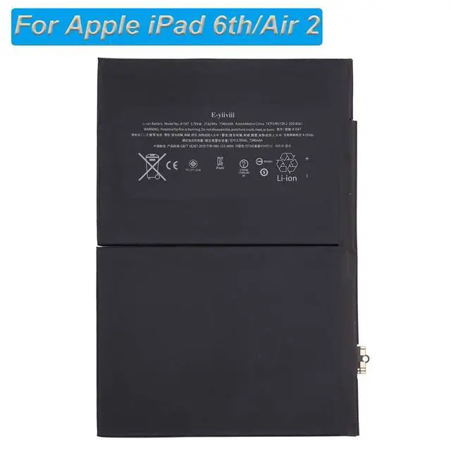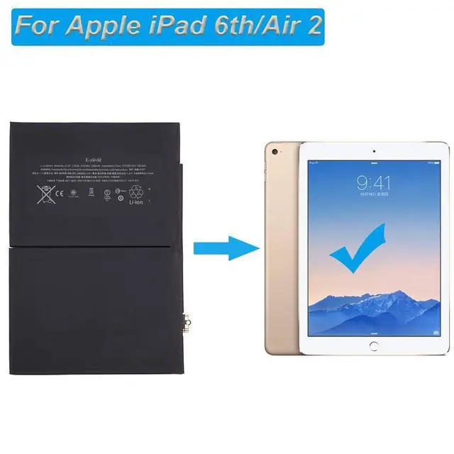 PolymerPackaging: 1 x battery, 1 x ToolsCompatible withApple iPad 6 iPad Air 2 iPad Air 2 WiFi A1547 A1566 A1567 MGKL2LL/A MGL12LL/ANotice before purchase1. Be carefully check the model number of your device to see if this battery is compatible with your device. 2. A new Li-ion battery will achieve its best performance after 2 or 3 complete cycles of charge & discharge. 3. When you install it, be sure the connector has been properly connected to your device. 4. Do not use low quality third-party adapter charger to charge your device, that will shorten the battery's life. Contact usIf you have any questions or any issues when using our product, please send us a message, we will answer you within 24 hrs. Thank you for your time.
