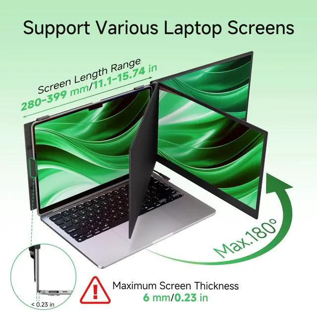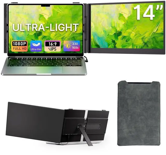 -: At just 0.25 inches ( 6.5 mm) thick-thinner than most smartphones and lighter than most laptops, this portable monitor for laptop slips effortlessly into bags. Perfect for travelers, digital nomads, and remote workers needing a truly mobile dual-screen setup without bulk ^^: Connect in seconds using included cables: Single USB-C (for Thunderbolt/DP-enabled devices) or USB-A/USB-C+HDMI combo. Zero drivers neededworks instantly with Windows, Mac, Android, iOS, Chrome OS, Linux, Switch etc. Fits 13-17" laptops with max. screen thickness 6 mm and screen length between 11.1 - 15.74 in ^^: Extend, mirror, or rotate your screen vertically. The secure top-hook mount and adjustable kickstand enable ergonomic viewing angles while eliminating tab-switching. This laptop dual monitor attachment is ideal for coding, trading, design, or multitaskingdouble your workspace instantly ^^ -: Expand your view and boost productivity instantly with this monitor extension for laptop. The 14 inch FHD 1080P IPS panel with 300 nits brightness provides ample screen real estate to comfortably view multiple windows side-by-side, making email, documents, research, and