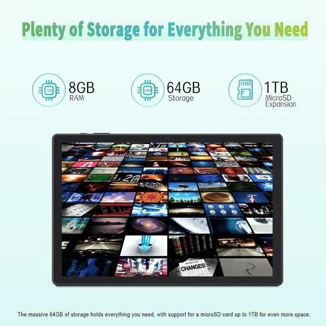 Whether it's videos, photos, apps, or documents, this Android tablet for adults provides plenty of space to store everything you need. ^^ [All-Day Power and Fast Connectivity] The 5000mAh battery in this Android tablet provides up to 8 hours of mixed use, including reading, video streaming, and web browsing. Plus, with dual-band 2.4G /5G Wi-Fi 6, youll enjoy a faster and more stable connection whether youre at home or on the go, making it the perfect choice for tablets for adults. ^^ [10 Inch Tablet with Case] The 10.1 inch Android tablet boasts a 1280x800 In-cell IPS display with a 16:10 aspect ratio, delivering vibrant colors and sharp images for an enhanced viewing experience.