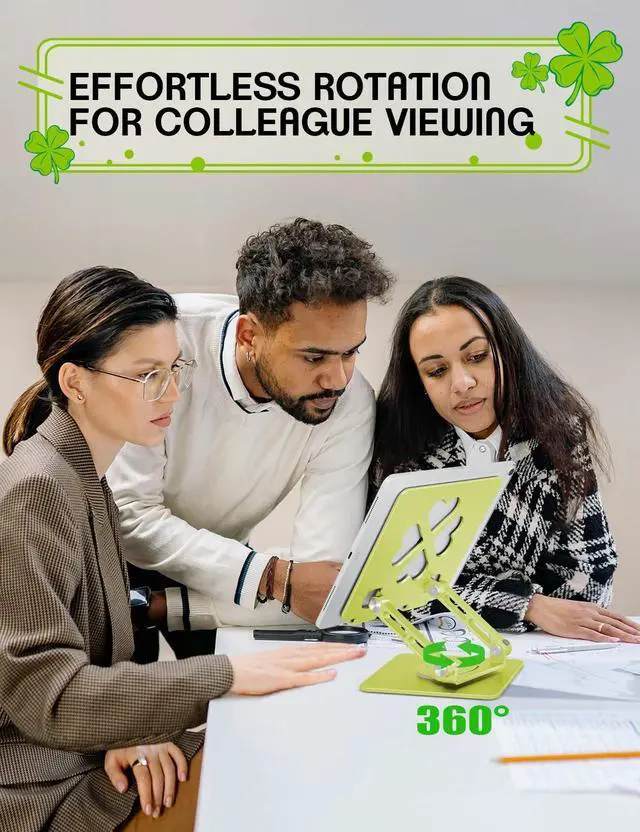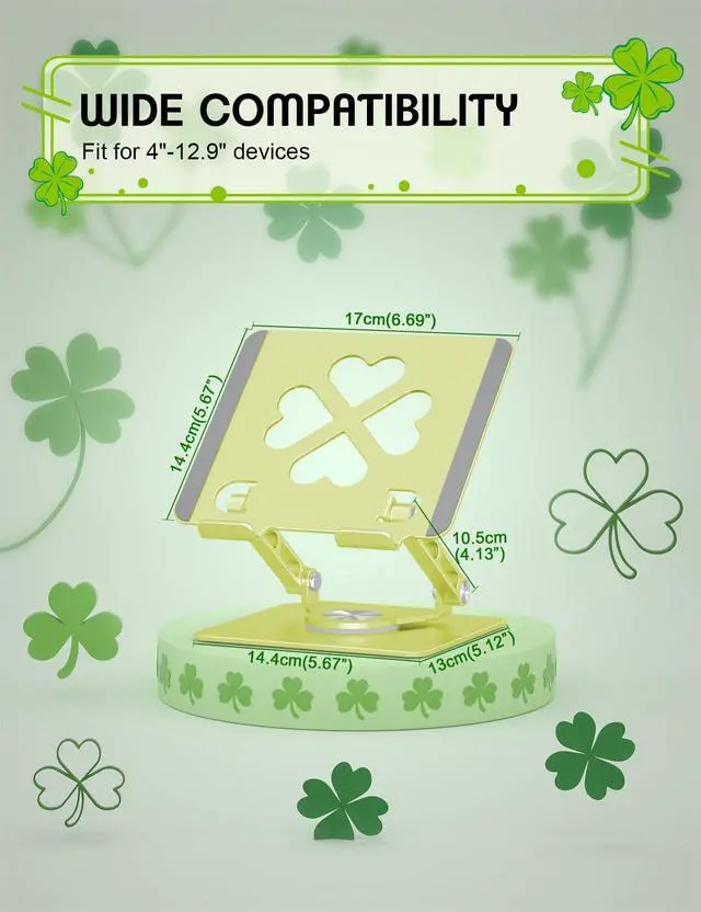 Stand: This iPad stand features a 360 rotating base, letting you easily switch between landscape and portrait modes. Perfect for video calls, meetings, and online learning, it enhances your desk setup with flexibility and convenience ^^ Four-Leaf Clover Tablet Stand -