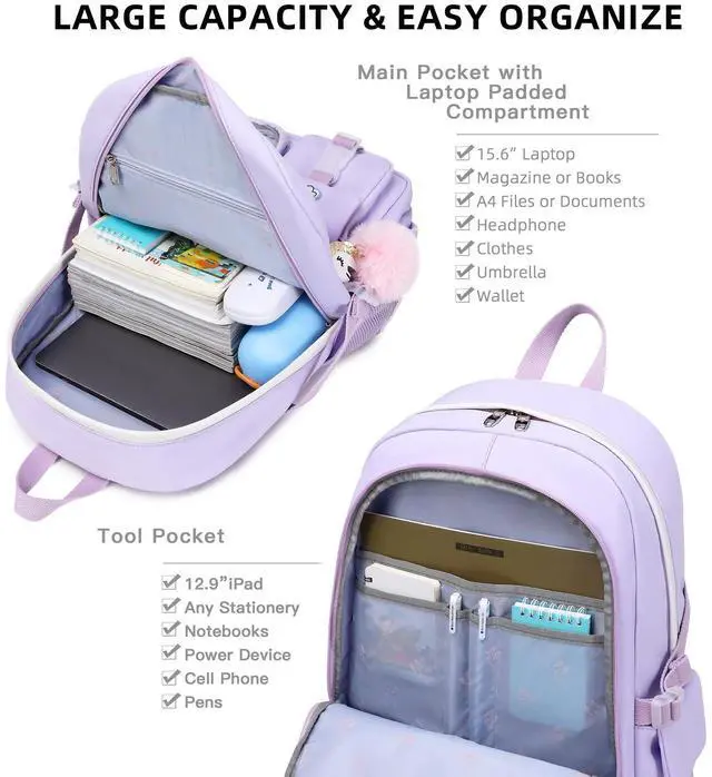 Multi-compartments & Large Capacity: The big bookbag has 7 separate different size pockets and two side pockets meet your daily storage. The front five pockets can hold charge device and other small items, convenient for your daily organization. The main pocket of includes laptop padded sleeve with elastic belt and hidden inner zipper pockets. The front tool pockets also come with multiple compartments to provide roomy space for necessities ^^ For Any Ages & Occasion The waterproof backpack purse is stylish enough for casual and student use, while the design provides the multi functionality. Backpack perfect for young teens, girls, ladies. The basic multipurpose daypack for most of your needs, easy to match your cloths, suitable for short trip, work, shopping, university, school, etc.