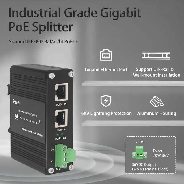 PoE Splitter 36V- powered by standard PoE IEEE 802.3 af/at/bt Power Source Equipment, The data transmission, up to Gigabit speeds, with power output voltages of 36VDC ^^ Port Configuration - Equipped with 1 x RJ45 10/100/1000Base-T PoE (Power + Data) Input Port + 1 x RJ45 10/100/1000Base-T (Data) Out Port, One 36VDC Output (2-pin Terminal Block) ^^ Multiple Protection- Support 1500V high voltage isolation circuit protection, which can effectively protect electrical equipment; Short-circuit protection for power output, Extensive LED indicators for PoE diagnostics ^^ Industry Grade Design- Rugged high-strength metal case, against electromagnetic interference and heavy electrical surges, -40C to 80C (-40F to 176F) operating temperature, can match a variety of harsh environment ^^ Usage scenarios- Small and exquisite appearance, support DIN-Rail & Wall-mount installation.