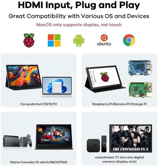 Packaging list: 2 x USB C Cable1 x HDMI-Mini HDMI Cable1 x VGA-Mini HDMI Cable1 x HDMI-Micro HDMI Cable1 x Stand