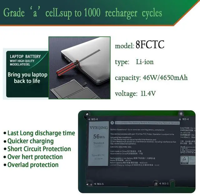 Condition: Brand New. ^^ Replace Part Number 8FCTC 69KF2 08FCTC 070N2F 70N2F M59JH 0M59JH P8P1P 0P8P1P DVG8M 0DVG8M ^^ Compatible with Laptop Modelsfor Dell Alienware M15 R3, M15 R4, M15 R5, M15 R6, M15 R7, m16 R1, M17 R3, M17 R4 / Alienware m15 Ryzen Edition R5 / Alienware m15 R7 AMD Series; for Dell Precision 5550 5560 5570 Series; for Dell Vostro 7510 7620 Series for Dell XPS 15 9500 9510 9520 9530 Series; for Dell G15 5510 5511 5520 5525 5530 / G15 5515 Ryzen Edition / G15 5521 Special Edition / G16 7620 7630 / G7 15 7500 Series; for Dell Inspiron 7510 5620 7610 / Inspiron 16 Plus 7620 7630 Series; ^^ VVXQING Promise All VVXQING's batteries are certificated by UL/CE/FCC/RoHS. Our batteries are tested by strict quality control standards to ensure that the capacity is true, stable current, low self-discharge. And we also have short circuit, overheat, and overload protections. We are confident in the performance of replacement batteries and professional service. ^^ TipsIf the new battery is not recognized during the initial installation, please reinstall and check if the interface is fully connected.